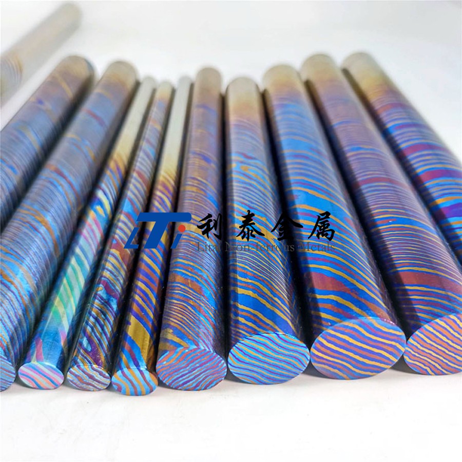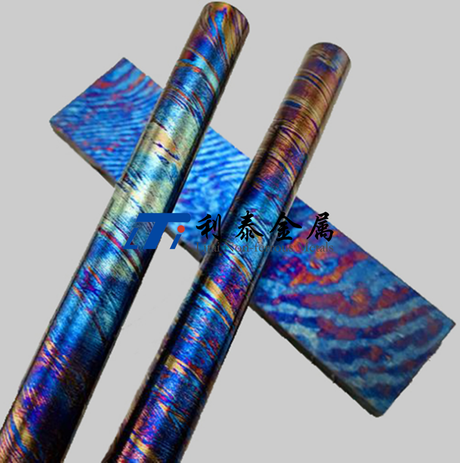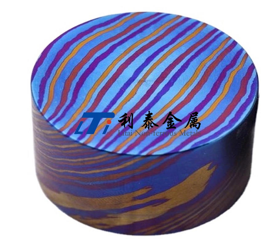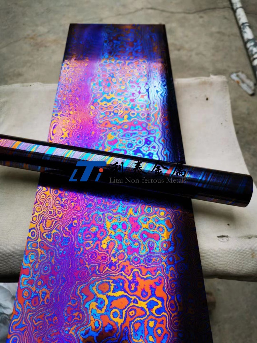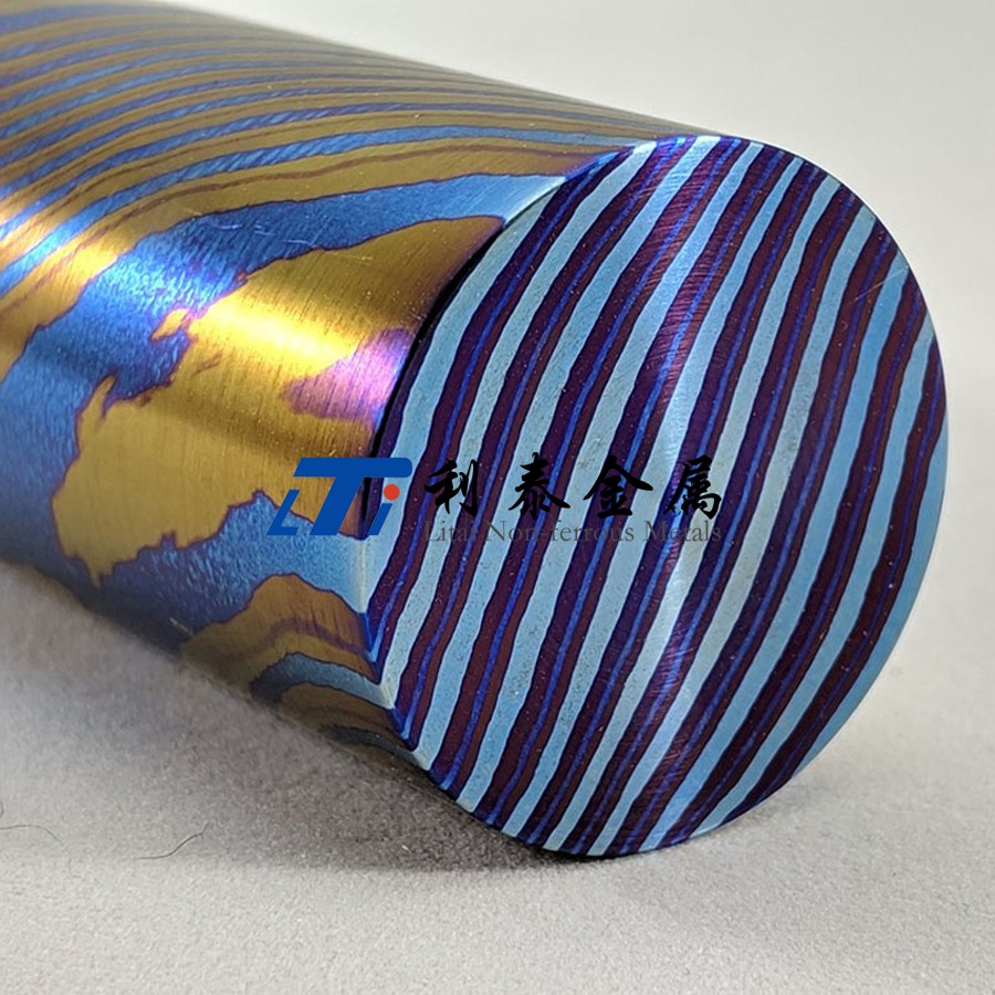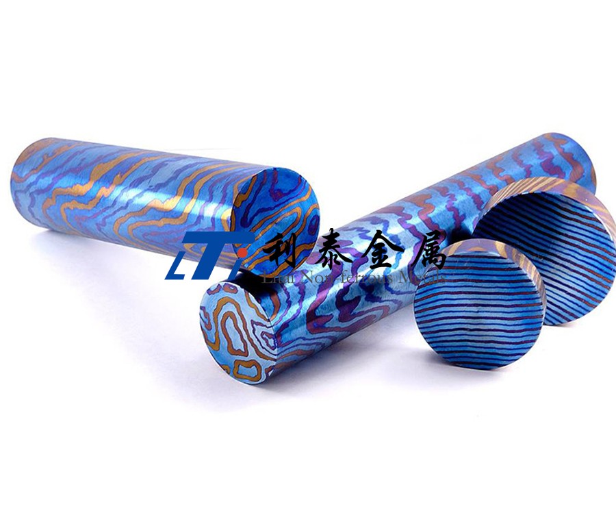 鈦馬士革是由兩種或兩種以上的鈦合金疊鍛而成。然后通過熱處理(鈦燒藍)或者陽極氧化,形成不同的顏色分層的鈦合金材質。