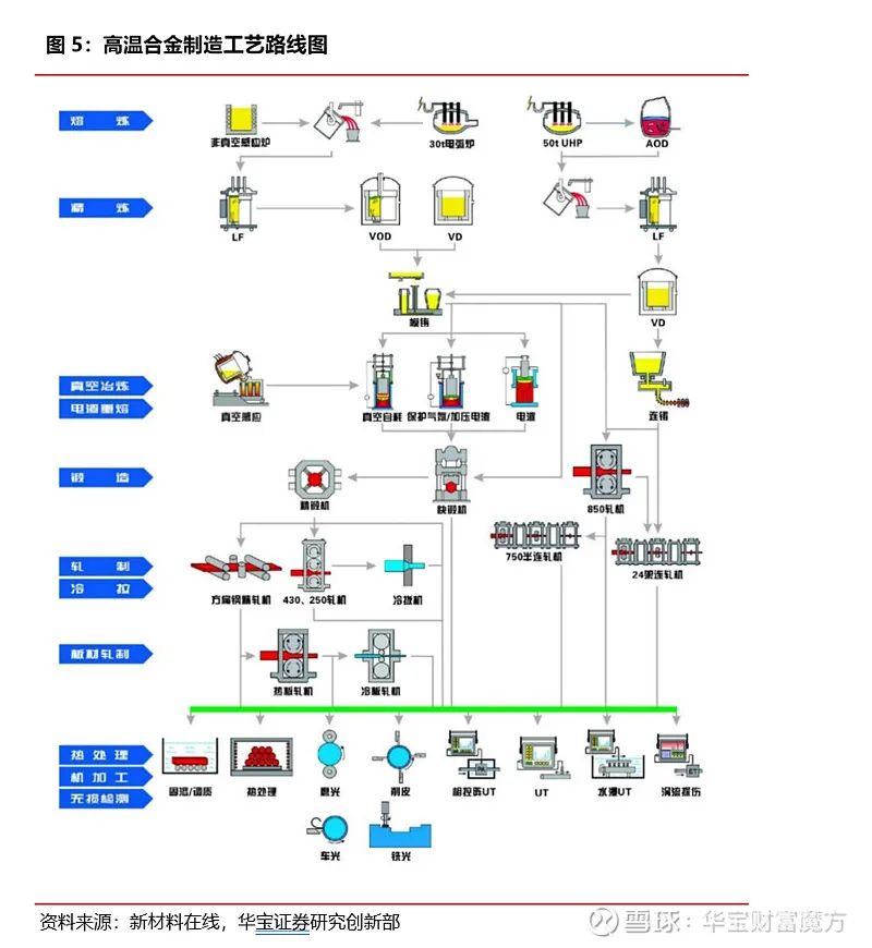 經過50多年發展,我國已經形成了比較先進,具有一定規模的生產基地。結合產業鏈各個環節相關參與方來看,目前我國生產廠商集中在航空航天領域用量最大的變形高溫合金冶煉和鍛造環節,因此在大批量生產高溫合金母合金、板、棒、鍛材上有很大的優勢。